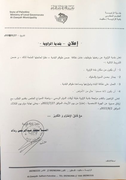 فعلى الراغبين بالتقديم ممن تنطبق عليهم الشروط مراجعة بلدية الزاوية طيلة ايام الدوام الرسمي حتى موعد اقصاه نهاية دوام يوم الخميس الموافق 2/ 08 / 2022