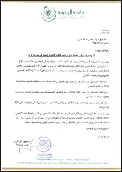تعلن بلدية الزاوية عن توفر خمس منح دراسية في جامعة الزيتونه للعلوم والتكنولوجيا…حيث المنح لجميع التخصصات ما عدى التمريض والبراميد….يبدأ التسجيل من تاريخ ١٥-٨-٢٠٢٢ في مقر بلديةالزاوية … للاستفسار الاتصال على الرقم السيد محمد عبد الرحمن رداد رئيس بلدية الزاوية 0562070002 او 0522973373